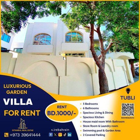 This semi furnished Stand Alone villa Located in Tubli near Highway, consist of 5 Bed rooms, 6 bath rooms, Modern kitchen, Spacious living & Dining, Laundry Area, Store room, Balcony, Spacious Garden Area, Swimming pool, covered car parking, Easy access to Isatown, Zinj, salmabad, Manama, Juffair, Saudi Causeway etc. rent is BD.1000/- per month without EWA.